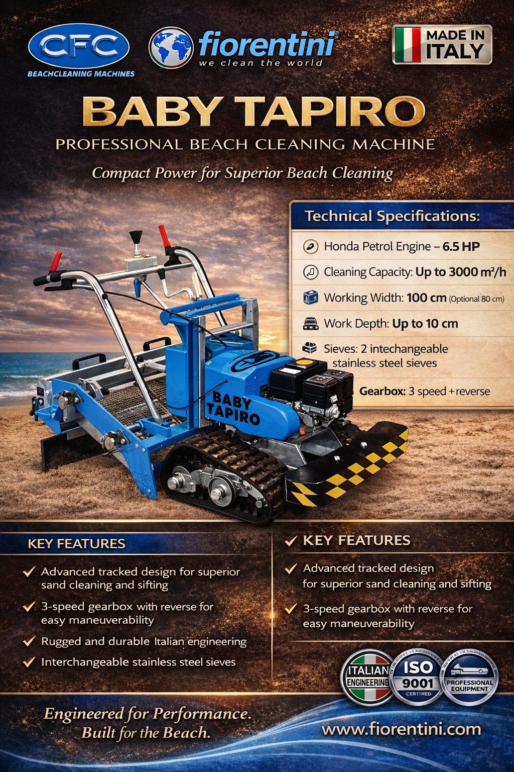 The Fiorentini Beach Cleaning Machine Baby Tapiro is compact yet powerful, ideal for small and medium beaches. Designed for efficiency, this Beach Cleaning Machine removes debris, shells, and waste with precision. Its lightweight design ensures easy mobility, making it the perfect Beach Cleaning Machine for resorts, parks, and coastal