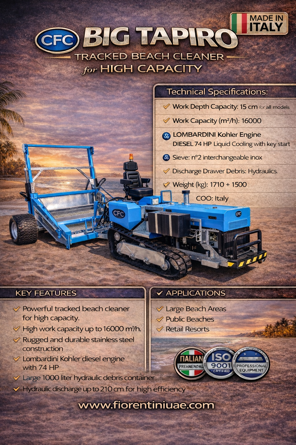 The Fiorentini Beach Cleaning Machine Big Tapiro is the ultimate solution for industrial-grade beach cleaning operations. Designed for maximum coverage, power, and durability, this advanced Beach Cleaning Machine efficiently removes all types of debris—plastic, glass, shells, and organic waste—while preserving the natural integrity of the sand.