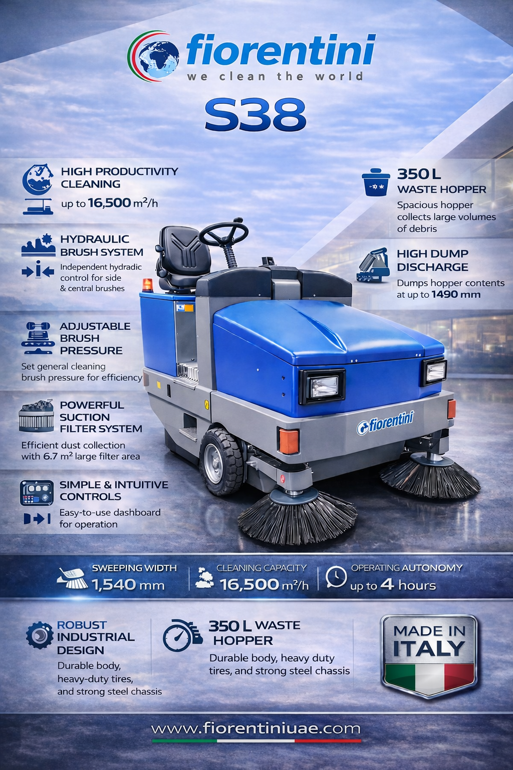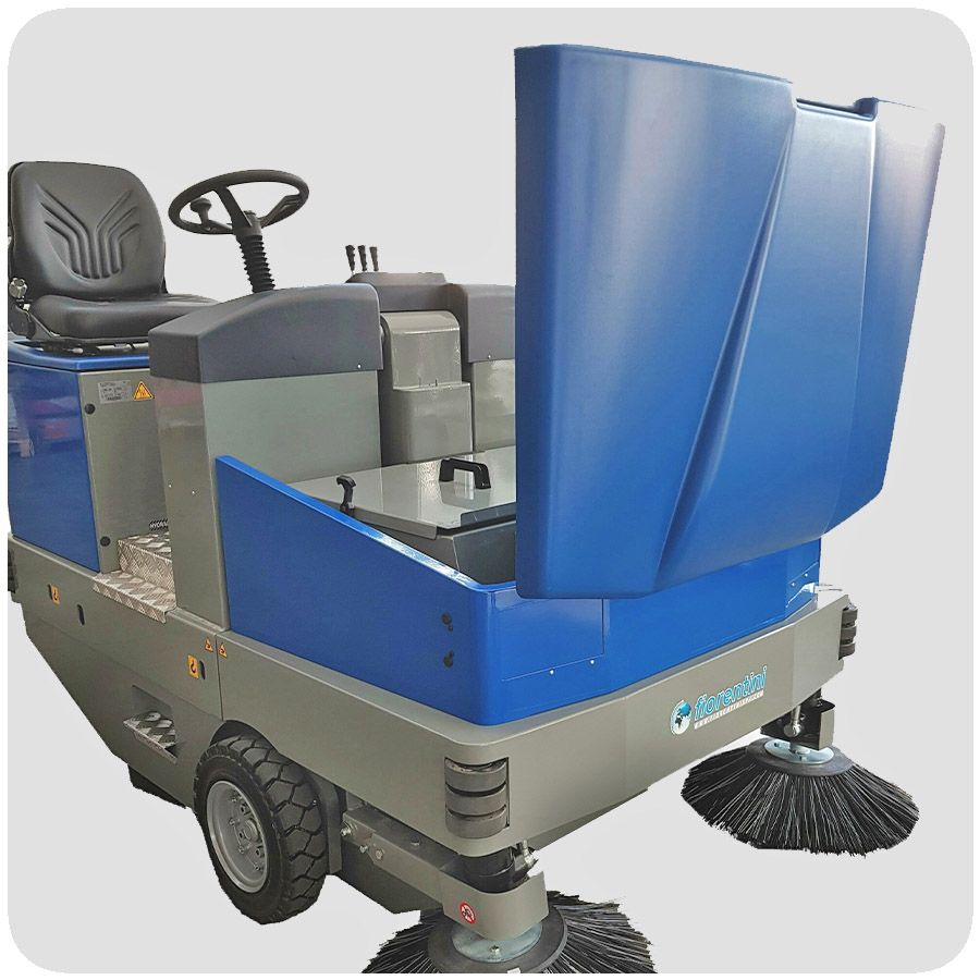 The Fiorentini Industrial Sweeper Machine S32 combines high productivity and strong suction for professional cleaning. Ideal for factories, parking lots, and warehouses, this ride-on sweeper efficiently collects fine dust and heavy debris for spotless results.