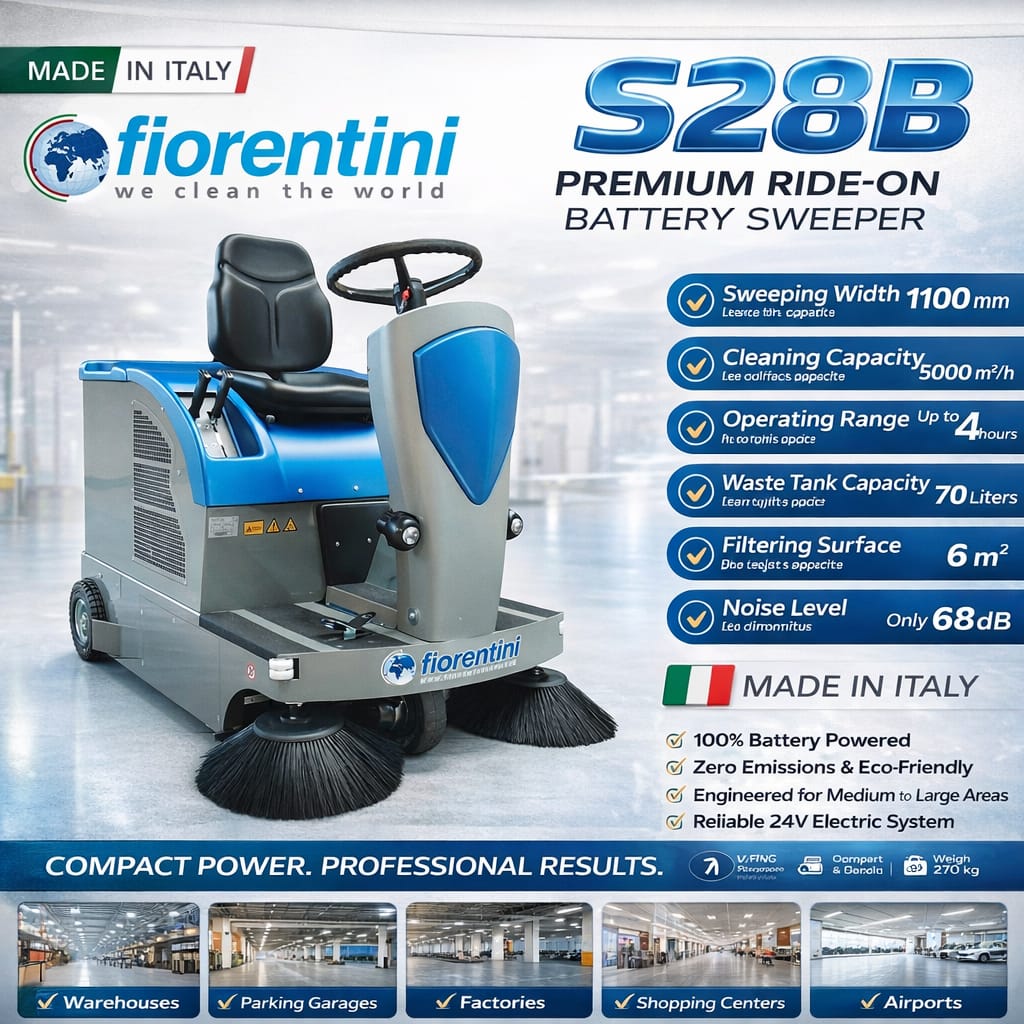 The Fiorentini Floor Sweeper Machine S28 is a powerful and efficient ride-on floor vacuum sweeper designed for professional cleaning in commercial and industrial environments. Built for high-performance sweeping, this machine effectively removes dust, debris, and dirt from large surfaces, making it ideal for warehouses, parking lots, shopping malls, airports, factories, and other high-traffic areas.