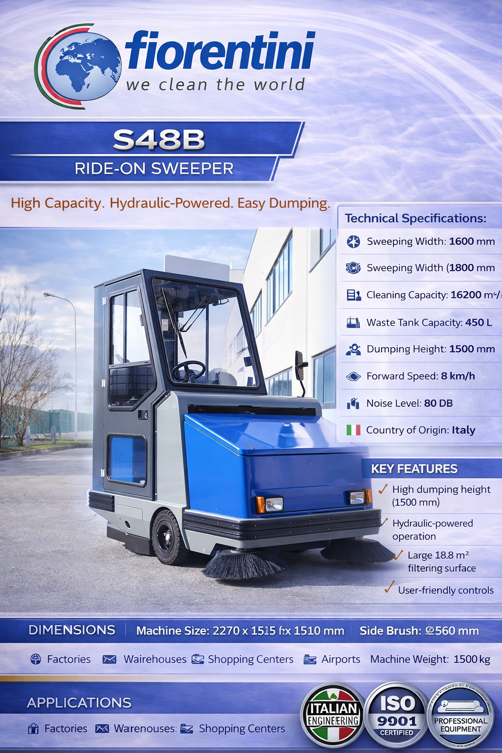 The Fiorentini Industrial Sweeper Machine S32 combines high productivity and strong suction for professional cleaning. Ideal for factories, parking lots, and warehouses, this ride-on sweeper efficiently collects fine dust and heavy debris for spotless results.
