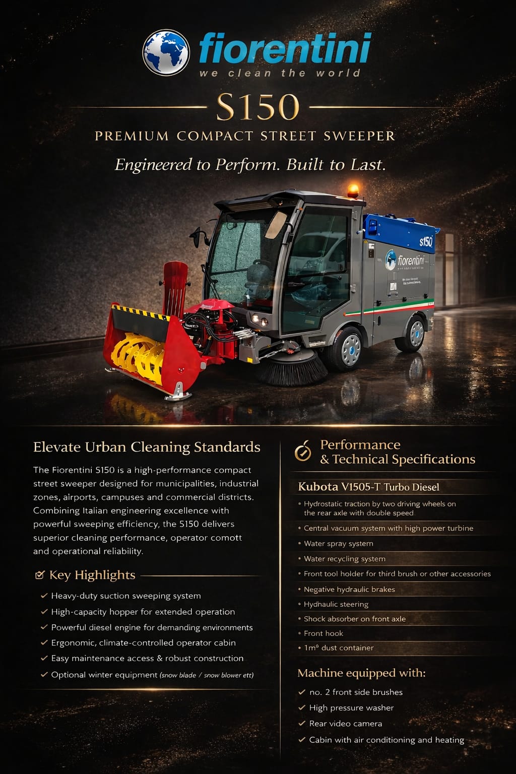 The Fiorentini Road Sweeping Machine S150 is a compact yet powerful Road Sweeping Machine built for precision and durability. Ideal for industrial and commercial spaces, this Road Cleaning Sweeper Machine ensures deep cleaning performance, efficient debris collection, and low maintenance—making it the perfect Road Sweeper Machine for modern cleaning operations.