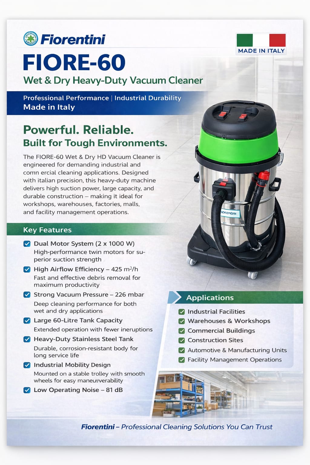 Functioning as a high-performance Wet And Dry Carpet Cleaner, the Fiore 60 removes moisture and dirt effectively from carpets and hard floors, maintaining hygiene and surface quality. Widely used across industrial facilities, warehouses, and cleaning service providers, this model is among the most trusted Industrial Vacuum Cleaners in its category.